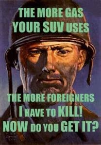 Some American champions for environmental and energy security posit a chain of logic that begins with Hummers and ends with terrorism. The basic argument goes as follows: Hummers, and other large fuel inefficient vehicles, require abnormally high amounts of gasoline to function. The refueling rate disproportionally increases US demand for petroleum, which reinforces US need for foreign oil. Inevitably, this sustained demand for petroleum imports secures continued American dealings with the Saudi oil market, which in turn increases Saudi wealth that is, at long last, used to finance terrorism.